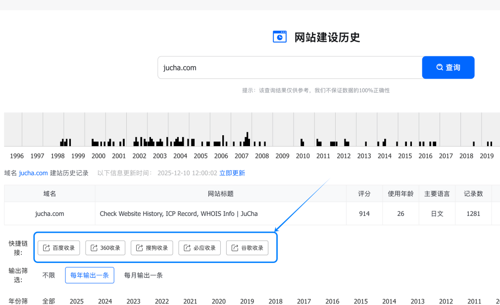 2、「建站历史详情页面」增加:百度收录,360收录,搜狗收录,必应收录,谷歌收录的快捷链接。