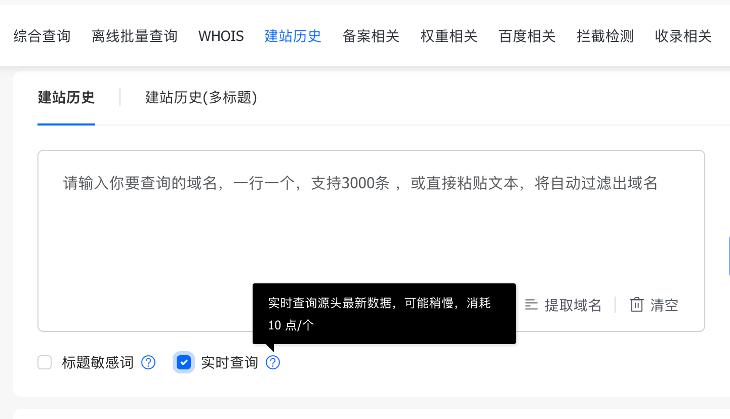 1、建站历史新增「实时查询」模式,直接调取源头最新数据,查询结果更精准、时效性更强。