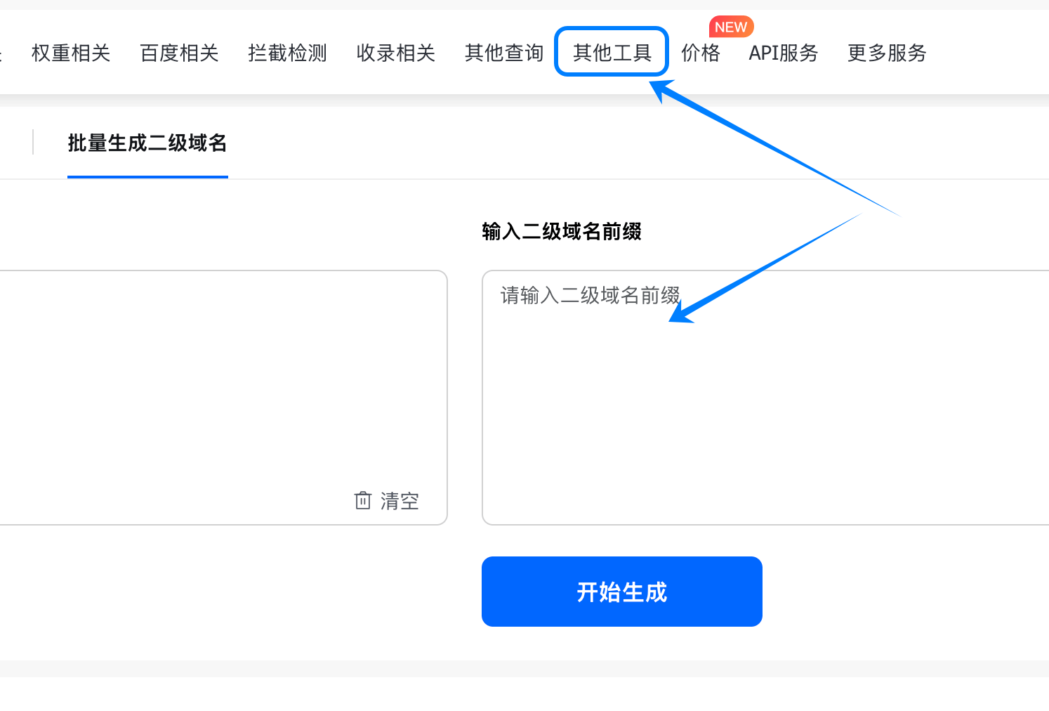 3、支持「批量输入二级域名前缀」,一键批量生成对应域名,大幅提升域名批量检索效率。