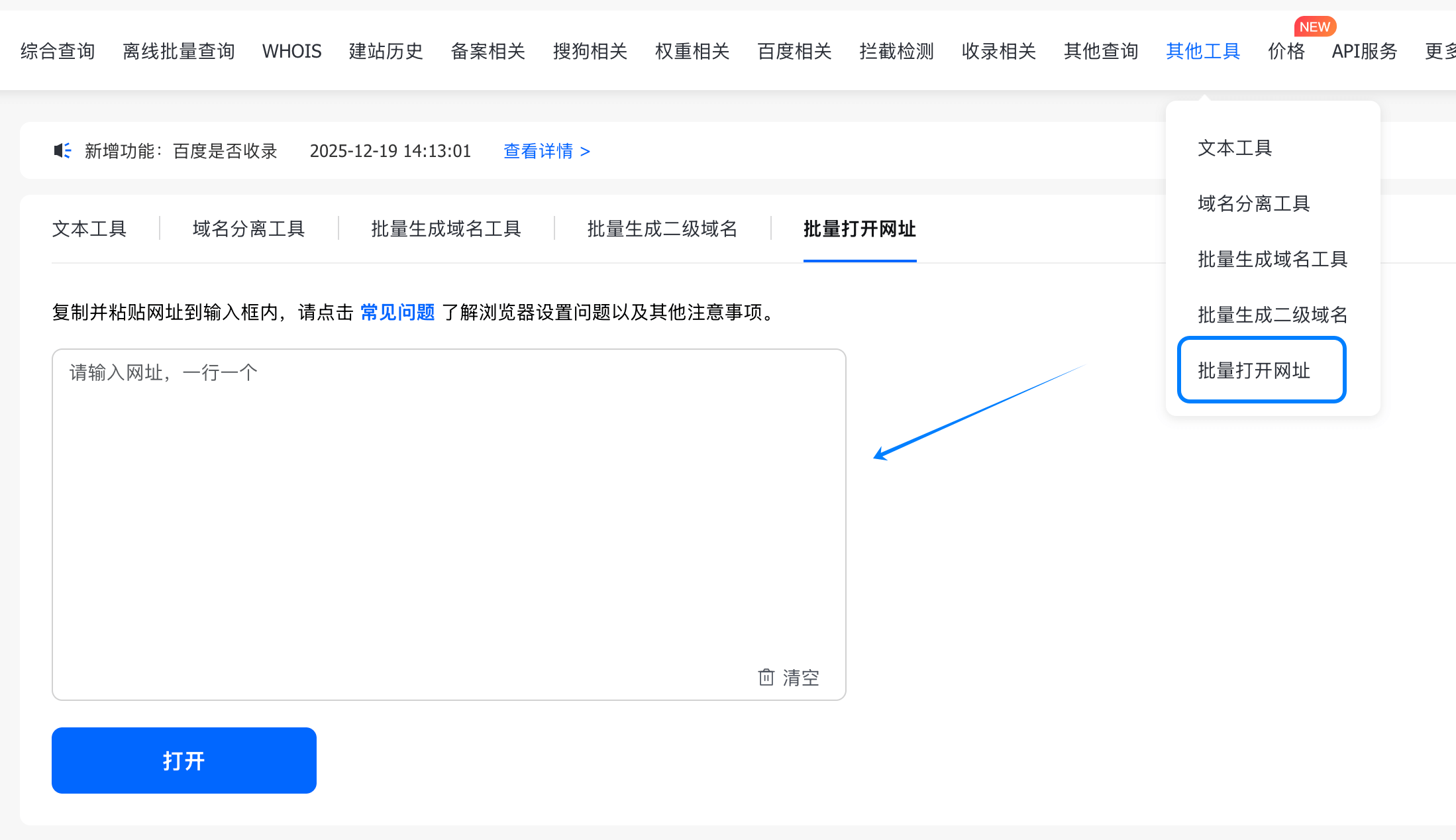 4、支持「批量打开网址」,一键批量打开输入的网址,更加方便高效。